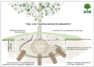 Primijeni li se DRILL 2 FILL BY HERBAFERTIL® METODA SADNJE, sadna bala ne može utonuti u tlo jer je dubina sadne jame jednaka visini sadne bale. Kako bi se omogućilo korijenu da se brzo i duboko zakorijeni, u dnu sadne jame pored sadne bale se buše 4 rupe dubine 35 cm. U njih se ugrađuju 4 vrećice Herbafertila®, koje potiču zdravi rast korijena i brže zakorijenjivanje što, između ostaloga, sprečava mogućnost vjetroizvale sadnice stabla. Zalijevanje preko uske perforirane drenažne cijevi na samo dno sadne jame omogućava razvoj korijena u dubinu, sprečava evaporaciju unesene vode i omogućuje njenu dužu prisutnost u tlu. Također te rupe sa Herbafertilom® omogućuju da u vrijeme kada ima suviše vlage u tlu, da se sadna jama preko njih drenira. Kada je sušni period, stablo izvlači vodu iz rupa u kojima je Herbafertil® koji zadržava vlagu. Također rahli sastav Herbafertila® omogućuje izmjenu plinova u korijenskom sustavu stabla.