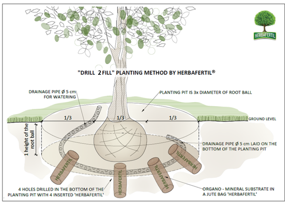 Primijeni li se DRILL 2 FILL BY HERBAFERTIL® METODA SADNJE, sadna bala ne može utonuti u tlo jer je dubina sadne jame jednaka visini sadne bale. Kako bi se omogućilo korijenu da se brzo i duboko zakorijeni, u dnu sadne jame pored sadne bale se buše 4 rupe dubine 35 cm. U njih se ugrađuju 4 vrećice Herbafertila®, koje potiču zdravi rast korijena i brže zakorijenjivanje što, između ostaloga, sprečava mogućnost vjetroizvale sadnice stabla. Zalijevanje preko uske perforirane drenažne cijevi na samo dno sadne jame omogućava razvoj korijena u dubinu, sprečava evaporaciju unesene vode i omogućuje njenu dužu prisutnost u tlu. Također te rupe sa Herbafertilom® omogućuju da u vrijeme kada ima suviše vlage u tlu, da se sadna jama preko njih drenira. Kada je sušni period, stablo izvlači vodu iz rupa u kojima je Herbafertil® koji zadržava vlagu. Također rahli sastav Herbafertila® omogućuje izmjenu plinova u korijenskom sustavu stabla.
